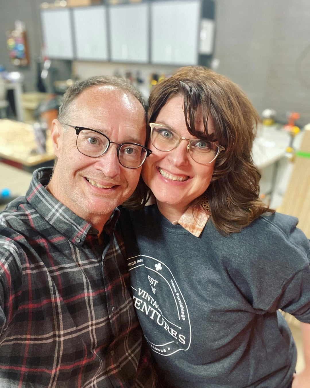 Welcome to Vintage Adventures. We’re Amie and Chris, a husband-and-wife team creating handcrafted wood art, home décor, jewelry, coasters, magnets, and gifts from our workshop in Anderson, Indiana.